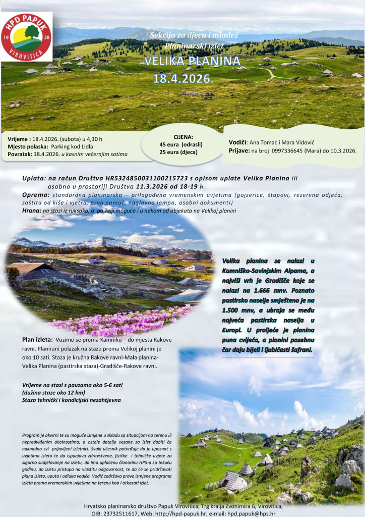 | Plaćanje | Uplata: na račun Društva HR5324850031100215723 s opisom uplate Velika Planina ili osobno u prostoriji Društva 11.3.2026 od 18-19 h |